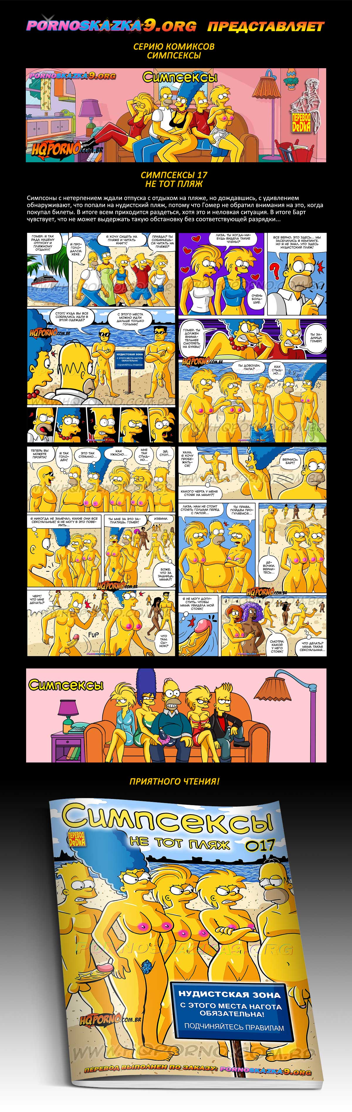 Порно комикс Симпсексы. Часть 17: Не тот пляж. Симпсоны с нетерпением ждали отпуска с отдыхом на пляже, но дождавшись, с удивлением обнаруживают, что попали на нудистский пляж, потому что Гомер не обратил внимания на это, когда покупал билеты. В итоге всем приходится раздеться, хотя это и неловкая ситуация. В итоге Барт чувствует, что не может выдержать такую обстановку без соответствующей разрядки…